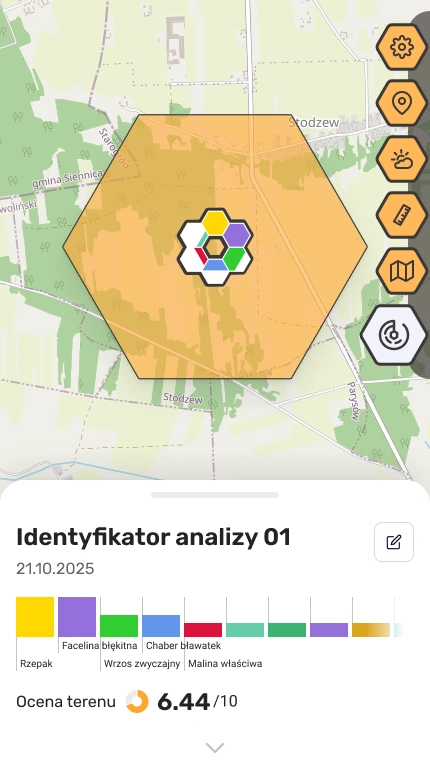 Hive Mind combines Earth observation satellite data, AI algorithms, and geospatial analytics to analyze areas chosen by the user. Before the analysis, the user can set an analysis radius ranging from 100 to 2000 meters (which is an optimal flight distance for a honey bee - beyond this range, the bees expend more energy returning to the hive than they can bring back in the form of pollen.) It is also possible to measure area and perimeter, check weather conditions, and mark custom locations.